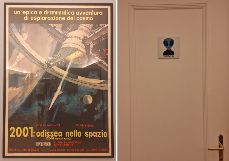 Alien signs on bathroom doors? Progressive. A space mosque sculpture at the entrance? True global citizenship. A vintage Italian poster of 2001: A Space Odyssey? Classy.